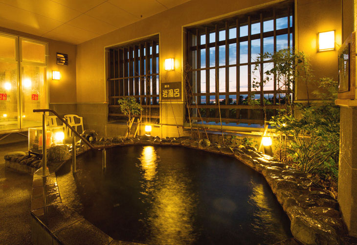 自慢の岩塩の露天風呂や内湯、サウナと多彩なお風呂をお楽しみいただけます。人気の炭酸泉導入致しました。 季節・時刻によって綺麗に沈む夕陽を眺めながらご入浴いただけます。