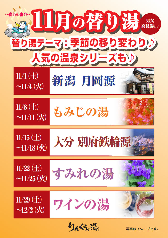 11月は「季節の移り変わり♪人気の温泉シリーズも♪」替り湯をお届けします!