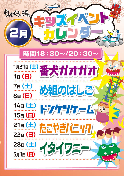 土曜日・日曜日は、18時30分と20時30分の1日2回キッズイベントを開催しています。