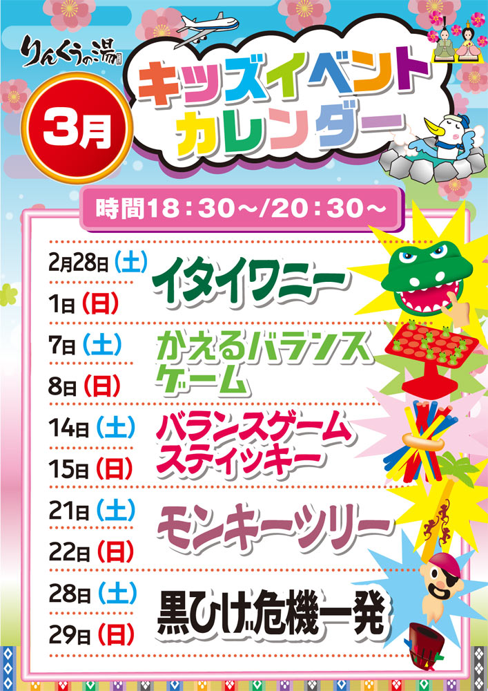 土曜日・日曜日は、18時30分と20時30分の1日2回キッズイベントを開催しています。