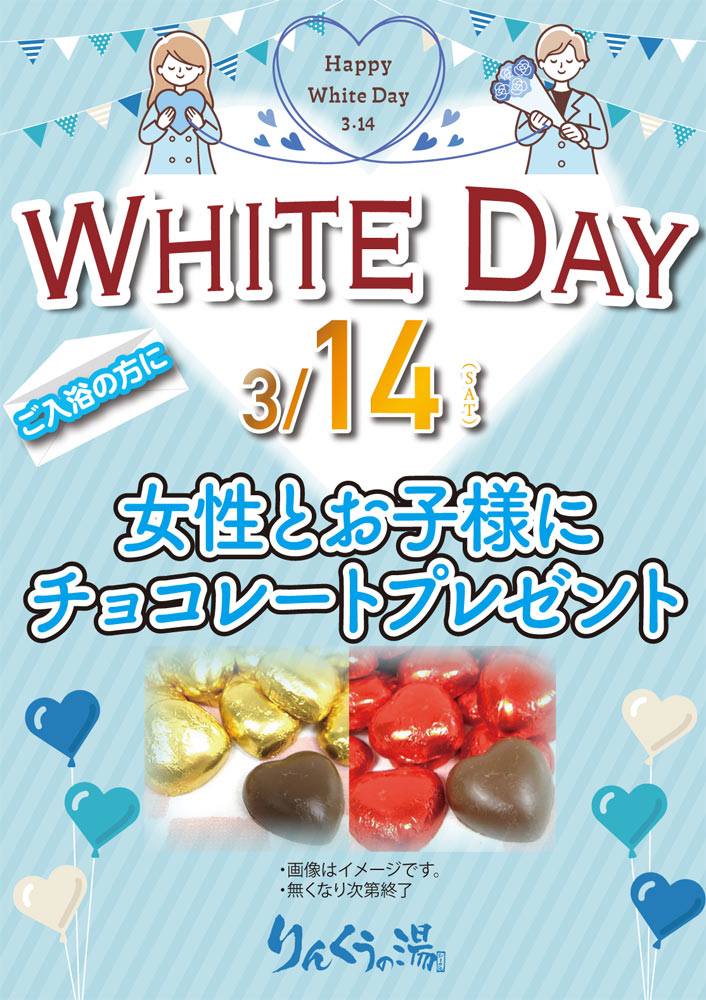 3月14日 ホワイトデーイベント 2026.02.20 ホワイトデーイベント 開催日:2026年 3月14日(土) 期間中、ご入浴の方 女性とお子様にチョコレートをプレゼント! Post Share Hatena LINE RSS feedly Pin it note 【毎週月曜】岩盤Hotヨガ教室 3/2、3/9、3/16、3/23、3/30 前の記事 サ活 塩サウナ 次の記事