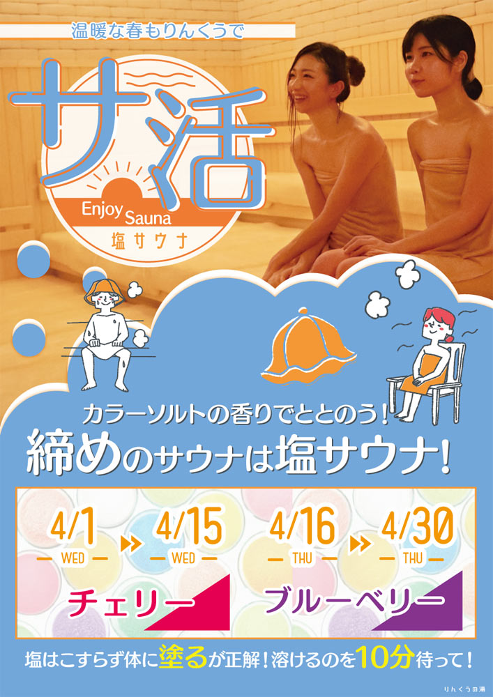 サ活 塩サウナ 2026.03.20 寒さが和らいだ時季もりんくうで サ活 カラーソルトの香りでととのう! 締めのサウナは塩サウナ! 4月1日~15日 塩サウナ:チェリー 4月16日~30日 塩サウナ:ブルーベリー Post Share Hatena LINE RSS feedly Pin it note 5枚集めてご入浴半額キャンペーン 前の記事 2026年4月キッズイベント 次の記事
