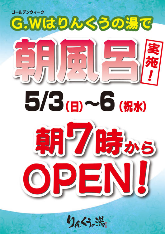 ゴールデンウィーク 朝風呂実施! 2026.04.20 ゴールデンウィーク朝風呂 朝7時オープン! りんくうの湯はゴールデンウィーク中も営業致します! 5月3日~5月6日は朝風呂、朝7時から営業です! 朝風呂 営業期間 朝風呂期間:5月3日(日)~5月6日(祝水) 営業時間:朝7時~24時 Post Share Hatena LINE RSS feedly Pin it note 5月5日 菖蒲湯 前の記事 2026年5月の替り湯 次の記事