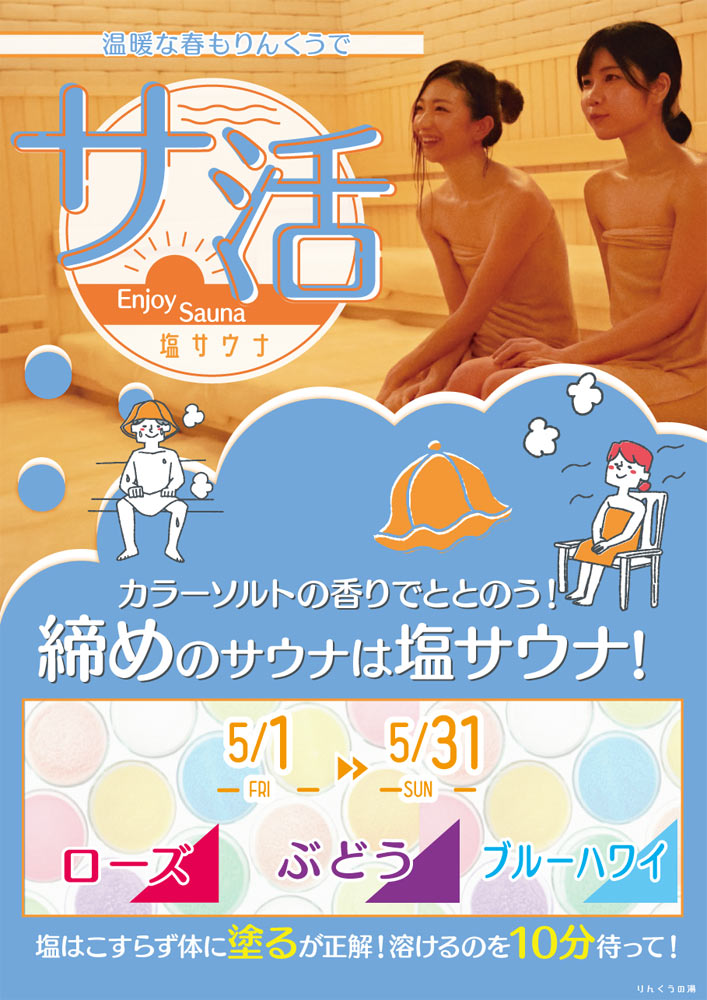 サ活 塩サウナ 2026.04.20 温暖な春もりんくうで サ活 カラーソルトの香りでととのう! 締めのサウナは塩サウナ! 5月1日~31日 塩サウナ: ローズ ぶどう ブルーハワイ Post Share Hatena LINE RSS feedly Pin it note 2026年5月キッズイベント 前の記事 5月5日 菖蒲湯 次の記事