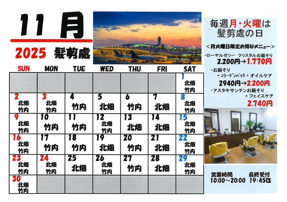2025年11月髪剪處カレンダー 2025.10.27 2025年11月髪剪處 毎週月・火曜は髪剪處の日♪ Tweet Share Hatena Pocket RSS feedly Pin it 2025年11月イベントカレンダー 前の記事